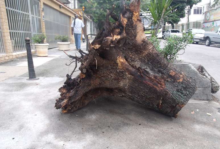 O tronco de uma árvore derrubada no dia 24 de dezembro, por um veículo da Comlurb (Companhia Municipal de Limpeza Urbana), ficou por mais de um mês sobre a calçada da rua Heráclito Graça, no bairro Lins de Vasconcelos, zona norte do Rio de Janeiro. O leitor José Carlos Pereira de Carvalho afirmou que a companhia havia prometido realizar a remoção no dia seguinte.