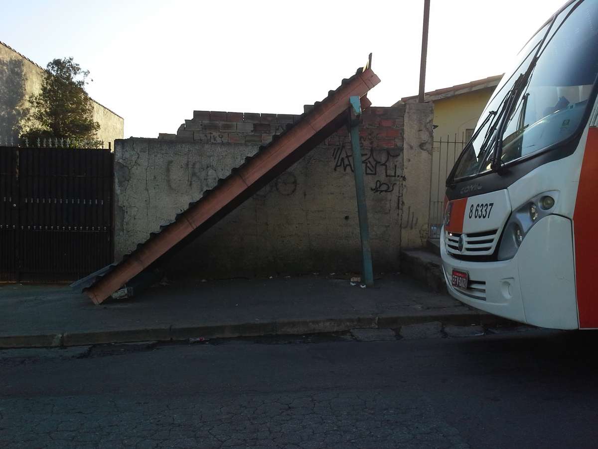 Um ponto de ônibus danificado causa risco a pedestres e passageiros que precisam aguardar o transporte público na altura do número 444 da rua Antônio José Bastos, no Parque Regina, zona sul de São Paulo. Uma das bases de concreto que sustenta o telhado do abrigo caiu. Segundo moradores da região, a estrutura está quebrada há cerca de 30 dias.