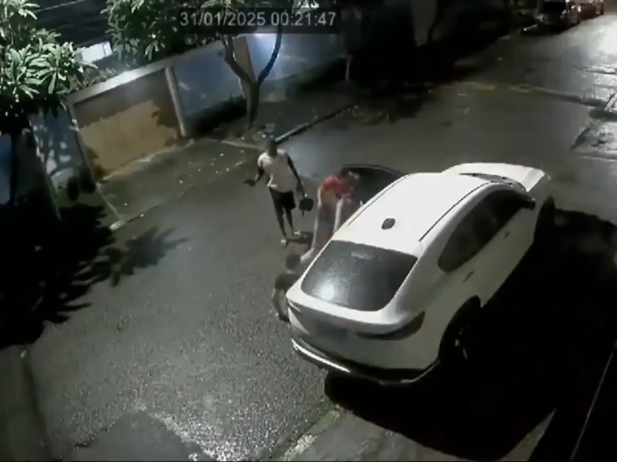Nas imagens, é possível ver o ex-jogador dentro do carro estacionado na rua quando os assaltantes chegaram em um veículo branco.