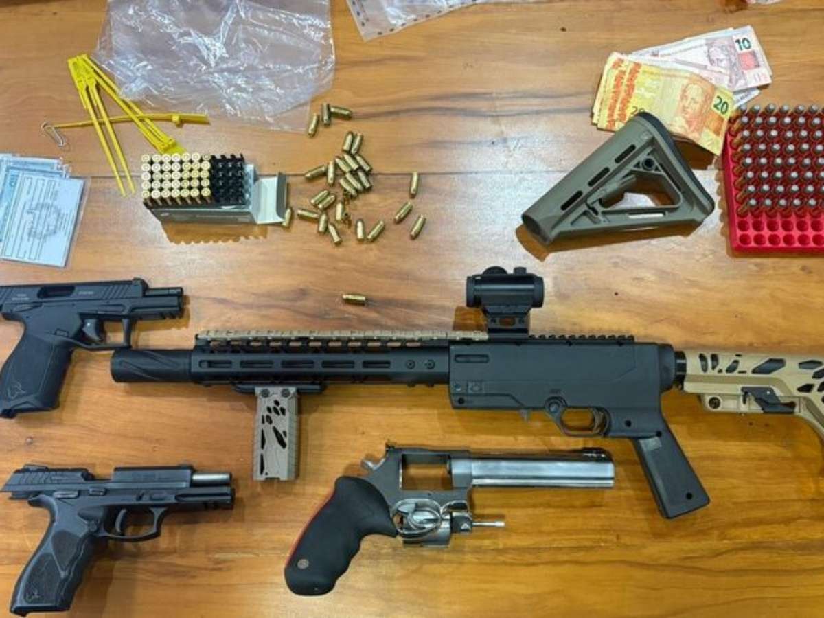 São cumpridos quatro mandados de prisão e 12 mandados de busca e apreensão. Um suspeito já foi detido, oito armas foram apreendidas, entre elas um fuzil, e R$75 mil encontrados.