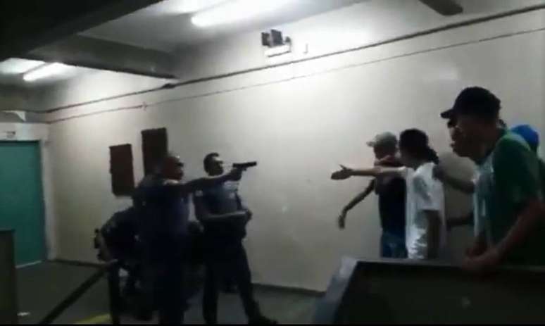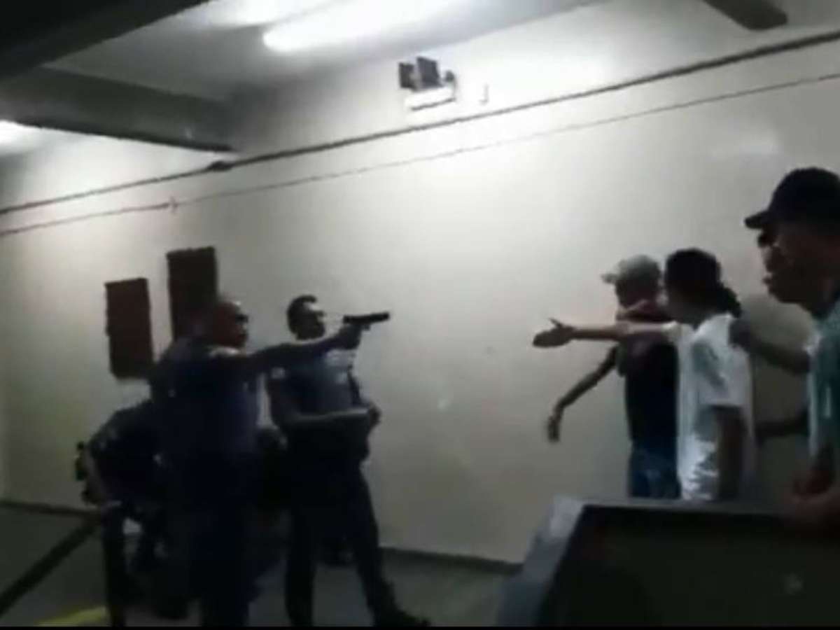 Enquanto um dos jovens aparece nas imagens imobilizado, o outro segue apanhando de um dos agentes, o que motiva os outros alunos a gritarem pedindo para que o policial pare a agressão. Nesse momento, um deles saca o revólver e aponta para os alunos.