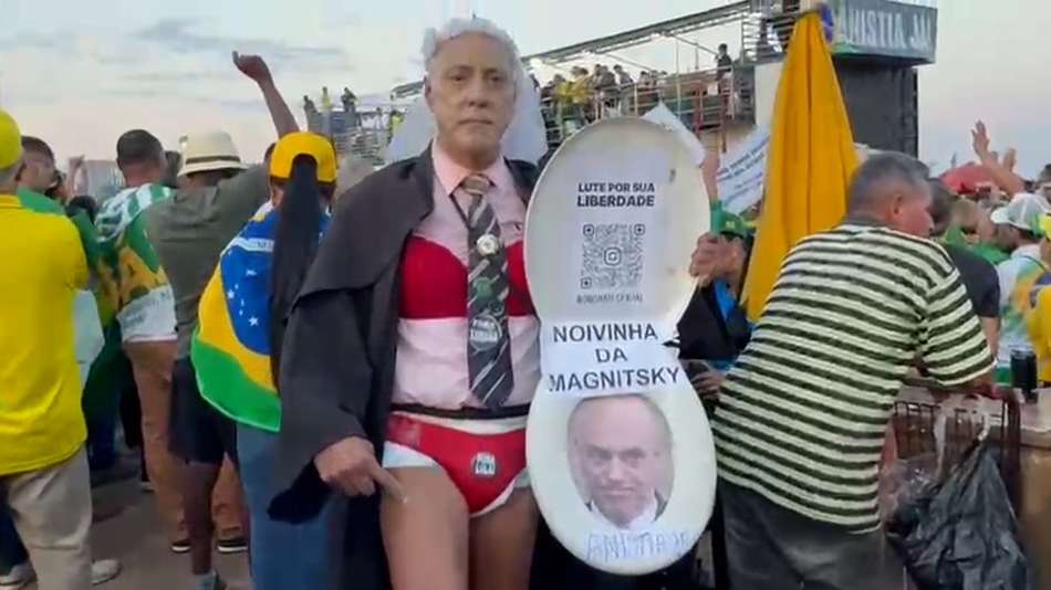Bolsonarista se fantasia de Moraes com roupa íntima e grinalda: 'Noivinha da Magnitsky'. O apoiador de Bolsonaro foi visto na manifestação a favor da anistia nesta terça-feira, 7, em Brasília. Julinho Coração de Leão é conhecido por ir aos atos em apoio ao ex-presidente fantasiado de Alexandre de Moraes. Deborah Sena/Redação Terra