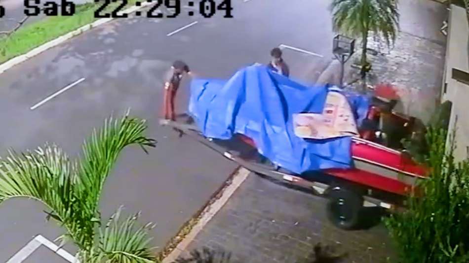 Morador de Uberlândia (MG) tem lancha furtada após esquecer portão da garagem aberto. Toda a ação, que ocorreu no último sábado, 14, foi registrada por câmeras de segurança instaladas no local. O furto foi cometido por dois homens, que fugiram com a embarcação a pé ao menos em um primeiro momento; um boletim de ocorrência foi registrado. Câmera de segurança