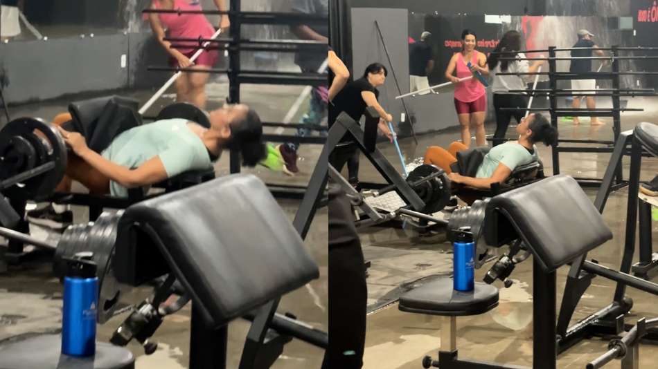 Mulher ignora alagamento e continua treinando em academia na Bahia