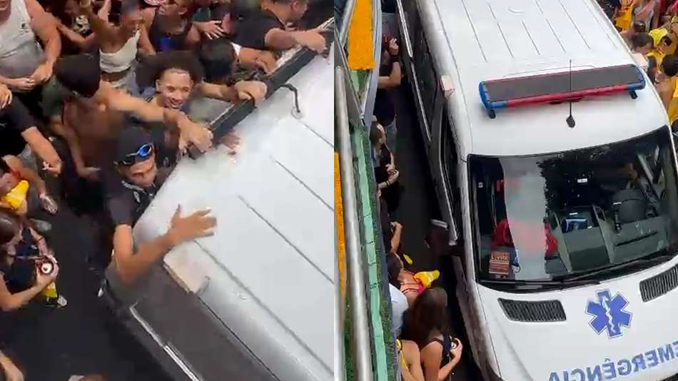Imagens registradas por foliões mostram o momento em que o veículo tenta avançar em meio ao público, no domingo, 8. Em determinado momento, alguns deles chegam a se pendurar na parte traseira da ambulância enquanto ela tenta avançar lentamente.