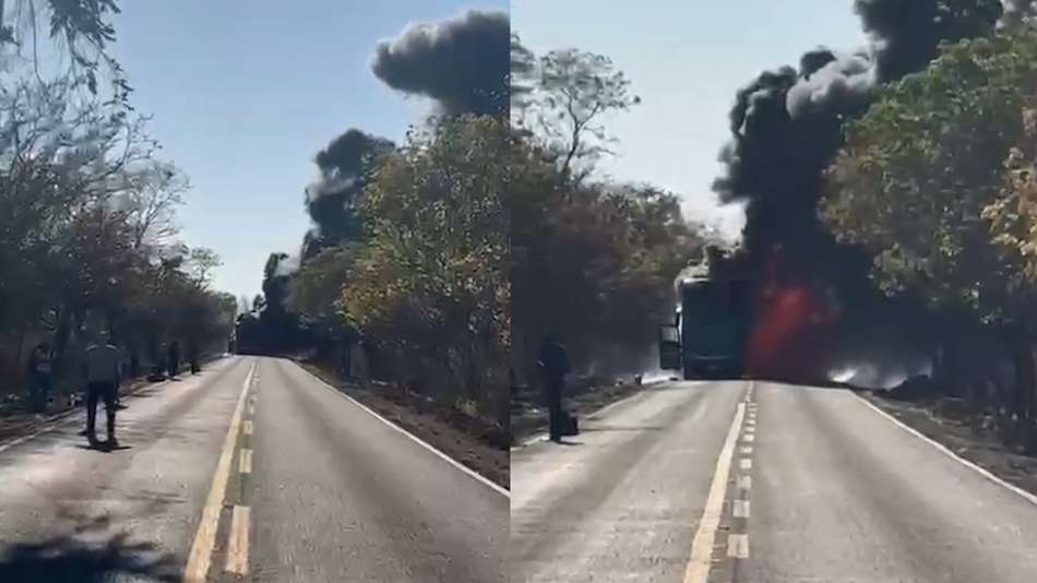 Ônibus com time de futebol pega fogo em rodovia de MG