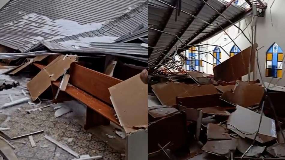O incidente aconteceu na manhã desta terça-feira, 26, após chuva de granizo atingir a cidade de Castro, nos Campos Gerais do Paraná. Vídeos da Paróquia Nossa Senhora do Perpétuo Socorro, que circulam nas redes, mostram a estrutura do telhado destruída. Segundo a Defesa Civil, ninguém se feriu e nenhuma celebração estava acontecendo no local no momento do desabamento; a igreja foi interditada. Reprodução/Eu fui para Aparecida do Norte/Facebook Reprodução/Florianópolis Praias SC/Facebook Reprodução/Santa Catarina No Feed/Facebook