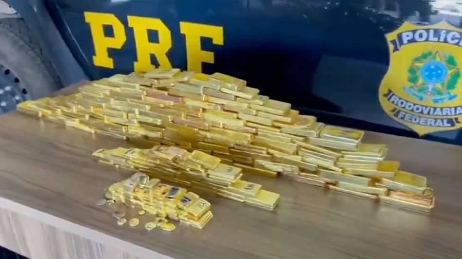 Veja o momento em que a PRF encontra mais de 100 kg de ouro escondidos em caminhonete em Roraima. A apreensão, a maior já feita no Brasil pela corporação, ocorreu na tarde da última segunda-feira, 4, na BR-401, em Boa Vista, capital do Estado. O montante apreendido chegou a 103 kg e foi avaliado em ao menos R$ 61 milhões; o veículo era guiado por um homem de 30 anos, que estava com sua esposa e uma criança. Ao abordar o veículo, os policiais encontraram inconsistência na documentação do carro e começaram a averiguar a situação. Os agentes, então, encontraram uma pequena quantidade de ouro, o que motivou a busca mais aprofundada no veículo e resultou na apreensão de 100 barras do metal. O motorista foi preso em flagrante e, agora, a investigação será conduzida pela Polícia Federal, para averiguar a origem, destino e propriedade do objeto. Divulgação/PRF