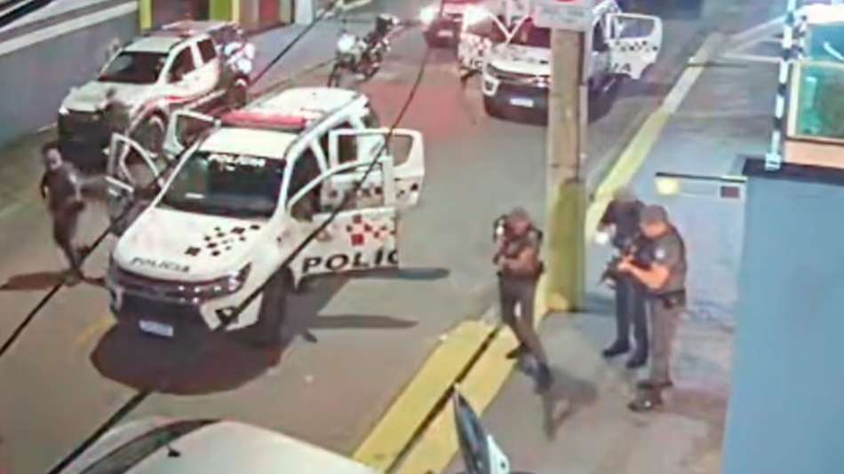 Vídeo mostra tiroteio que deixou PM e mais três mortos após assalto a farmácia no interior de SP. Uma câmera de segurança registrou o tiroteio, que ocorreu na madrugada deste sábado, 11, em Sorocaba. No vídeo, é possível observar que diversas viaturas interceptam um veículo que seria utilizado na fuga após um assalto a uma farmácia. Segundo a TV Tem, afiliada da TV Globo, o grupo tentava fugir levando cerca de R$ 3 mil em espécie e 63 medicamentos emagrecedores. No confronto, o policial militar Matheus Almeida Rodrigues, de 28 anos, foi atingido, socorrido, mas não resistiu aos ferimentos e morreu. Em nota, a SSP-SP lamentou a morte do agente e disse que um Inquérito Policial Militar será instaurado; o caso também é investigado pela Polícia Civil. Reprodução/Sargento Barbosa ROTA 1/Facebook