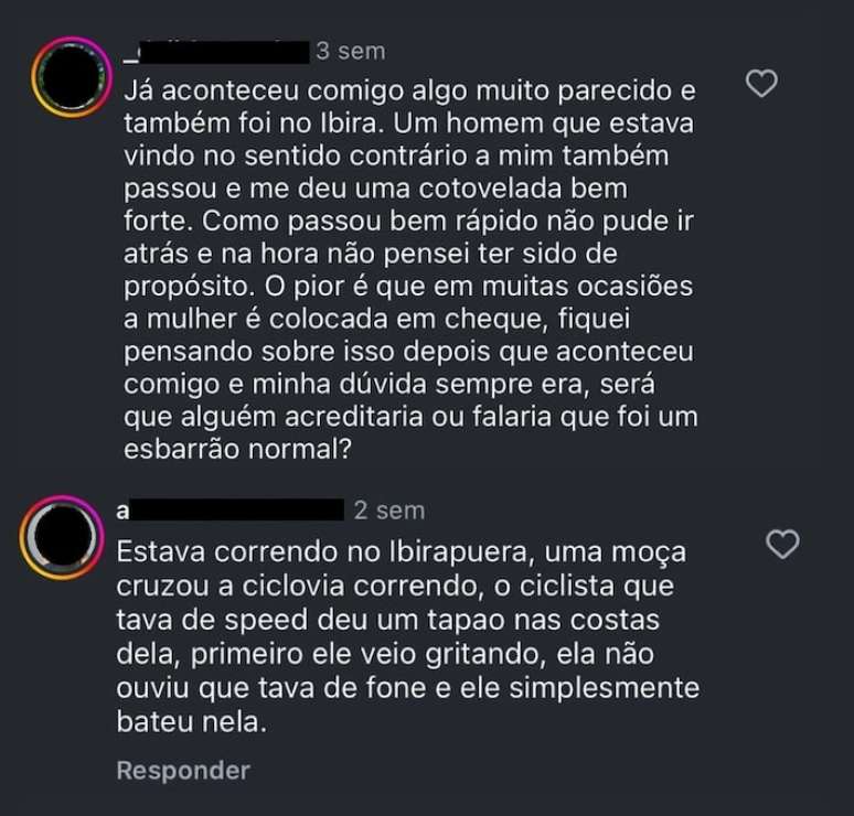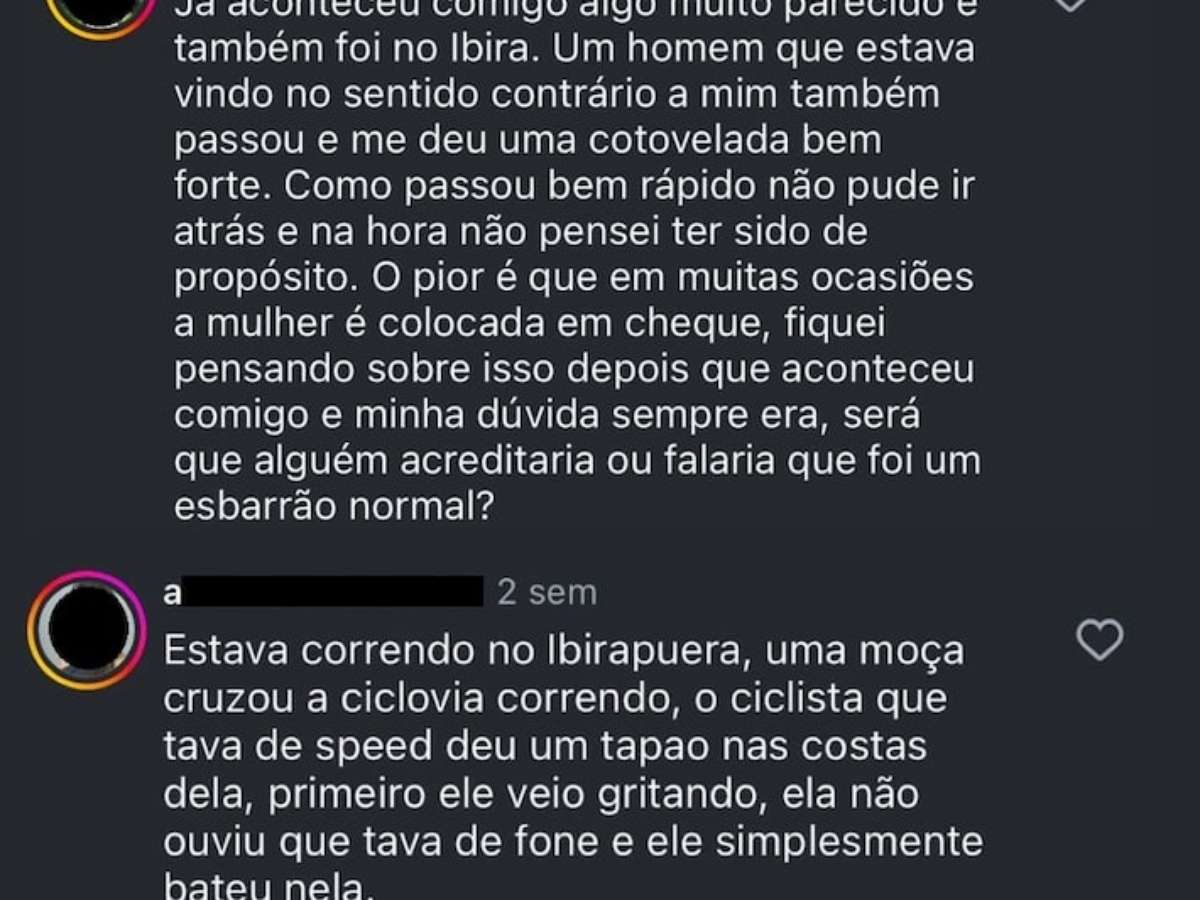 "Estava correndo no Ibirapuera, uma moça cruzou a ciclovia correndo, o ciclista que tava de speed deu um tapaço nas costas dela. Primeiro ele veio gritando, ela não ouviu porque tava de fone e ele simplesmente bateu nela."