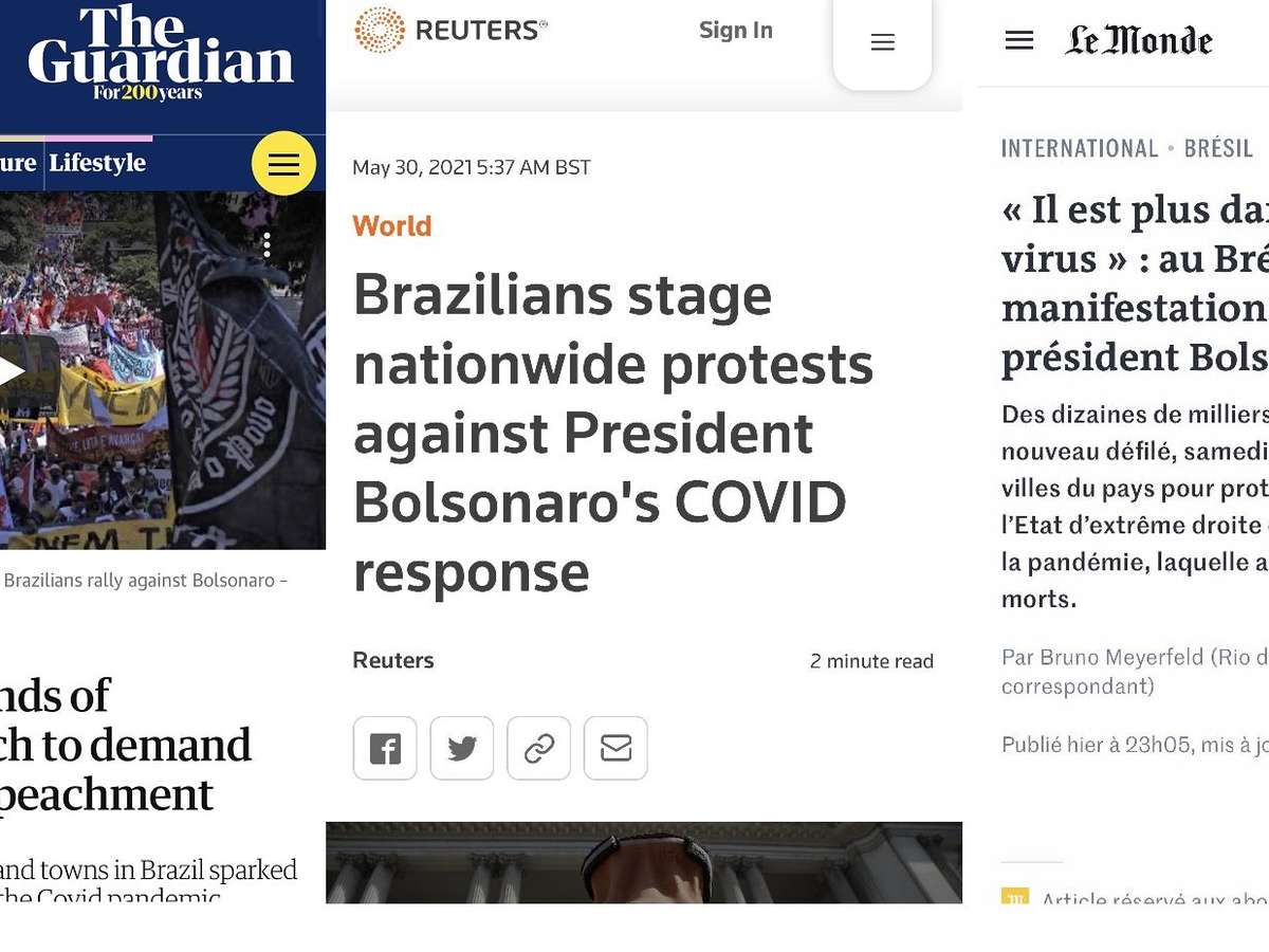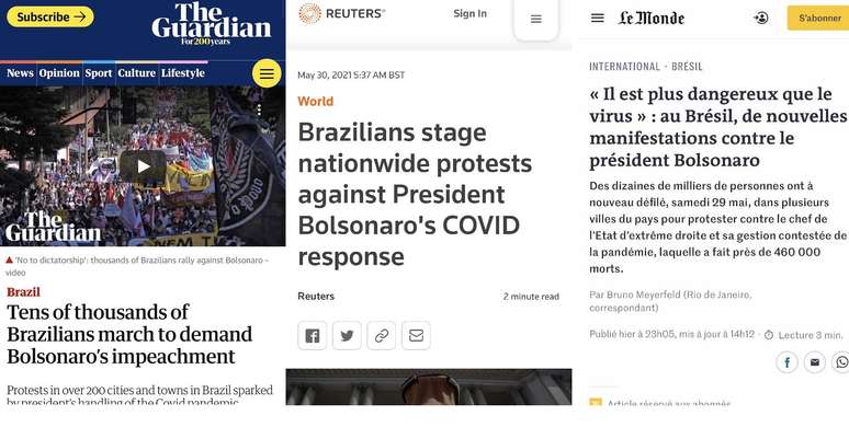 protestos pedindo o impeachment de Jair Bolsonaro e a ampliação da oferta de vacinas no Brasil ganham destaque em alguns dos principais jornais e televisões do mundo inteiro neste fim de semana