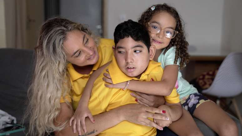 Anne Caroline Rosa ajeita o filho Moisés no colo e lhe dá um cheirinho no pescoço, enquanto sua mais nova, Maria, faz cafuné na cabeça do irmão.