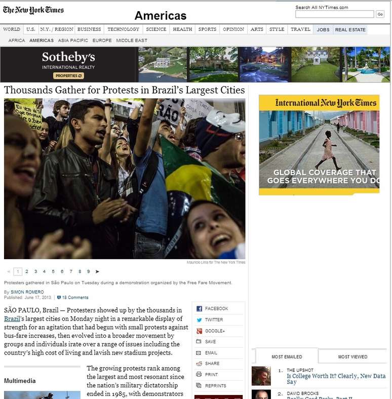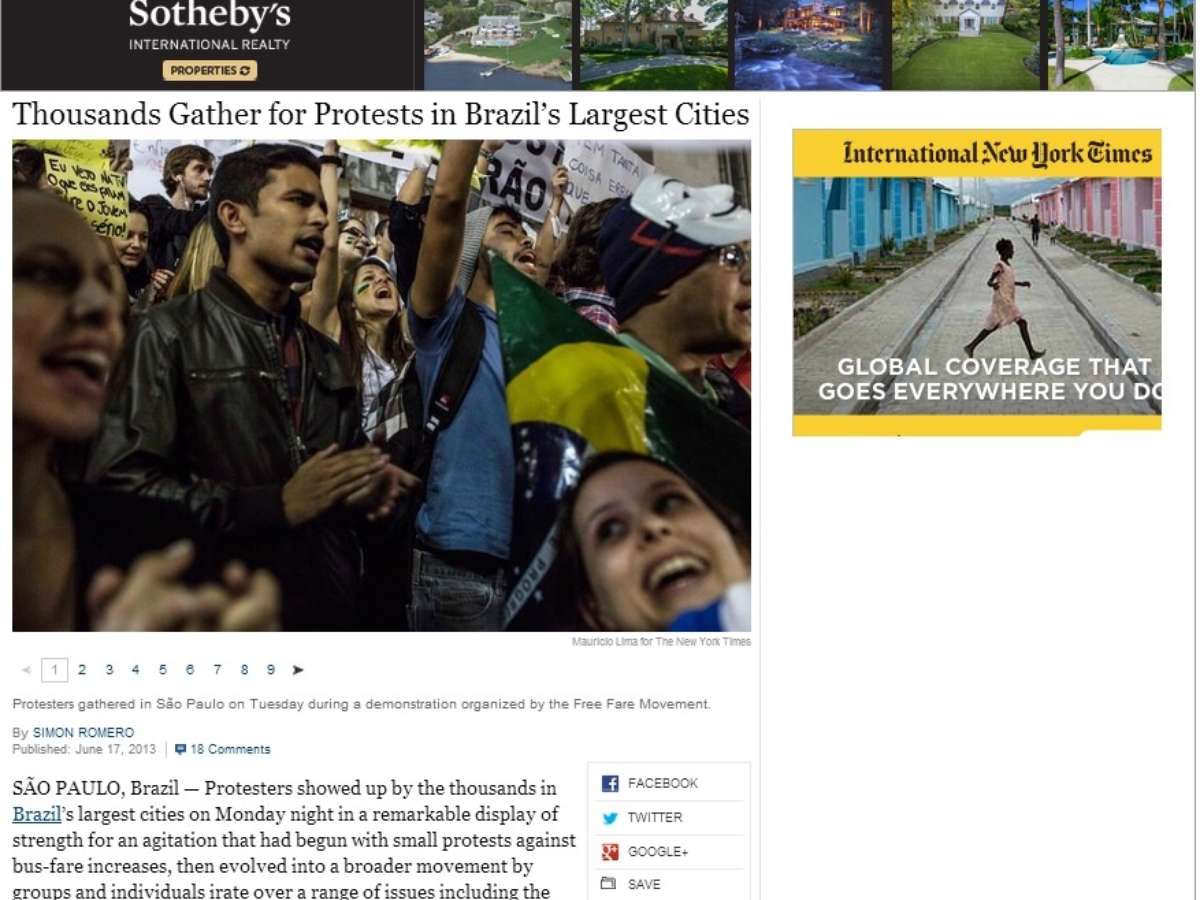 No dia 17 de junho, por exemplo, ninguém menos que o The New York Times, um dos jornais mais influentes do mundo, descreveu a maior das manifestações que havia acontecido até então como uma “notável demonstração de força” da população brasileira. O jornal explicou ainda que o movimento começou com protestos pontuais e contrários ao aumento da tarifa dos ônibus, mas que em pouco tempo se ampliou até incluir outras frustrações nacionais, como o desconforto diante dos elevados gastos com a Copa e a péssima qualidade dos serviços públicos.