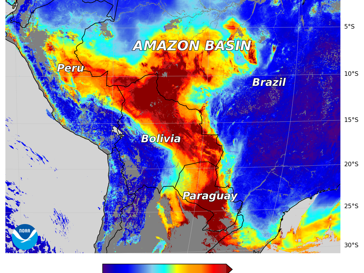 Imagens de Satélite disponibilizadas por instituições como a Administração Oceânica e Atmosférica Nacional dos EUA (NOAA) ou a Agência Espacial Americana (Nasa) mostram essa poluição avançando, se espalhando desde o Norte do Brasil e da Bolívia para regiões do Paraguai, Argentina, Mato Grosso do Sul, Santa Catarina e, Rio Grande do Sul