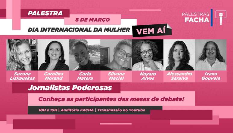 Para debater todas essas questões, a Facha convidou seis jornalistas mulheres: Suzana Liskaukas, que colabora para os suplementos especiais do jornal Valor Econômico, portal Convergência Digital e InfoMoney; Carolina Morand, âncora do programa "Ponto Final", da CBN, e apresentadora do podcast "Ao Ponto", do jornal O Globo; Carla Matera, repórter na FluTV; Silvana Maciel, repórter na CBN; Nayara Alves, locutora na rádio Antena 1; e Alessandra Saraiva, coordenadora digital no Valor Econômico.