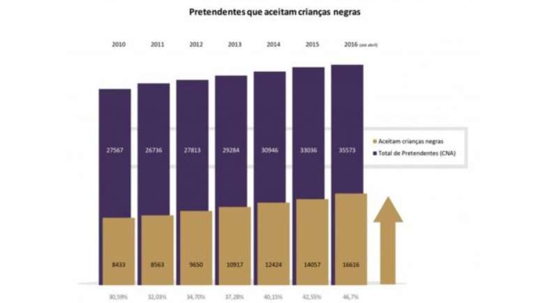 Em 2010, por exemplo, pretendentes à adoção que aceitam somente crianças brancas eram 38,7% dos candidatos a pais adotivos, mas esse índice em 2016 (até maio) é de 22,5%. No mesmo período, o percentual de candidatos que aceitam crianças negras saltou de 30,5% a 46,7%.