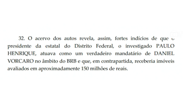 "O acervo dos autos revela, assim, fortes indícios de que o presidente da estatal do Distrito Federal, o investigado PAULO HENRIQUE, atuava como um verdadeiro mandatário de DANIEL VORCARO no âmbito do BRB e que, em contrapartida, receberia imóveis avaliados em aproximadamente 150 milhões de reais", afirma Mendonça.