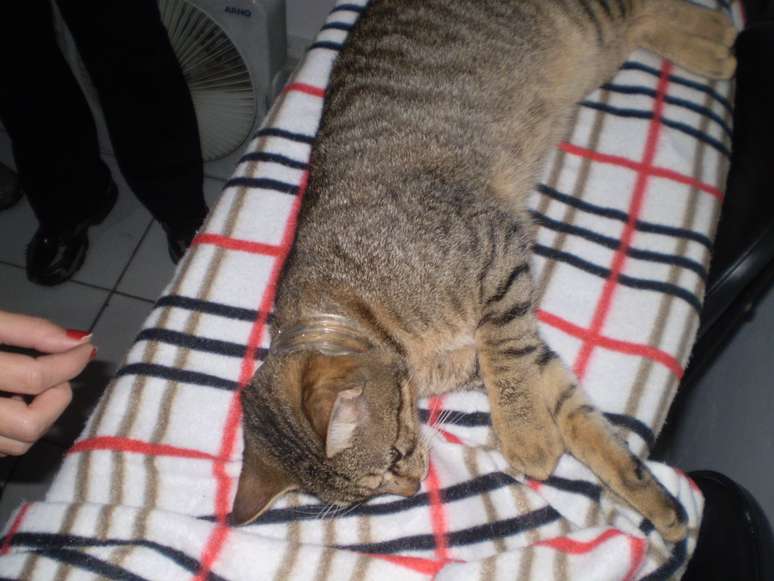 O felino foi sedado e o objeto de vidro foi retirado. Ele não ganhou um nome oficial, mas a aluna da UFSC que abrigou o gato depois do resgate apelidou ele de Argola