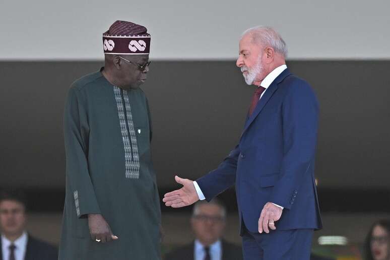 Lula, acompanhado do ministro das Relações Exteriores, Mauro Vieira, saudou o presidente nigeriano na chegada ao Palácio do Planalto, onde foi realizada a cerimônia oficial com a execução dos hinos nacionais dos dois países.