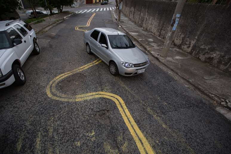 Moradores pintam faixas no asfalto para desviarem de buracos