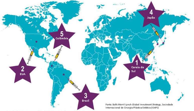 Na Coreia do Sul, que está no topo do ranking, uma em cada 50 pessoas fez cirurgia plástica em 2014.