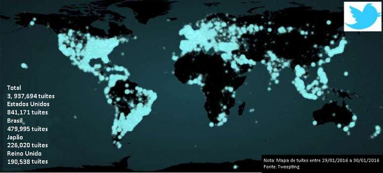 O mapa mostra a atividade no Twitter em tempo real entre os dias 29 e 30 de janeiro deste ano.