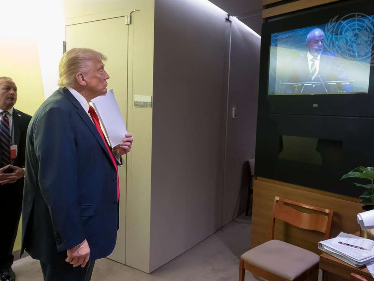 A Organização das Nações Unidas divulgou uma foto que mostra o presidente dos Estados Unidos, Donald Trump, assistindo ao discurso de seu homólogo brasileiro, Luiz Inácio Lula da Silva, na Assembleia-Geral, na última terça-feira, 23.