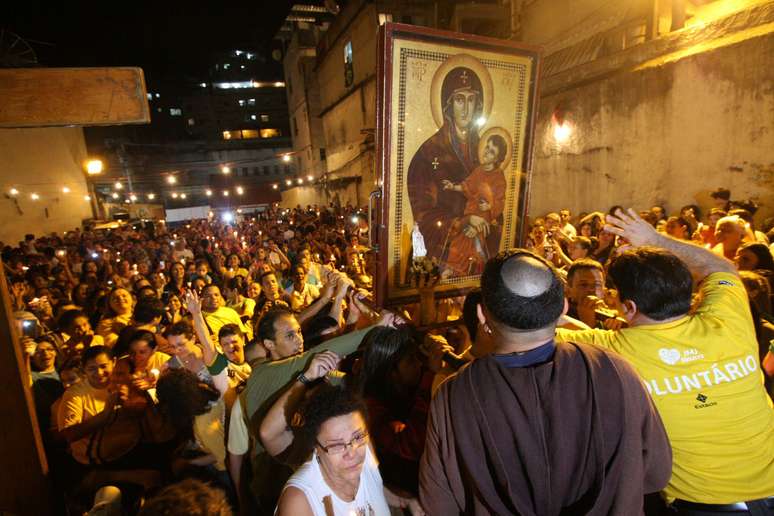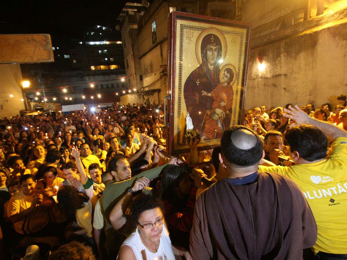 Os símbolos chegaram a bordo de um veículo da prefeitura do Rio de Janeiro à comunidade, onde vivem cerca de 100 mil pessoas, e dezenas de moradores carregaram a cruz e a imagem nos ombros por cerca de 1 quilômetro, até chegar à paróquia de Nossa Senhora da Boa Viagem.