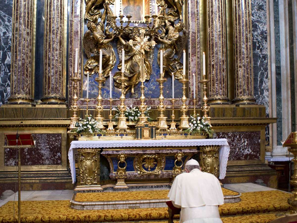 O Papa entrou por uma porta lateral da enorme basílica, que foi aberta ao público. Ele se recolheu em uma capela diante da imagem da Virgem chamada "Madonna Salus Populi Romani" e permaneceu imóvel em oração silenciosa por meia hora, antes de colocar flores e acender uma vela em que foi impresso o logotipo da JMJ.