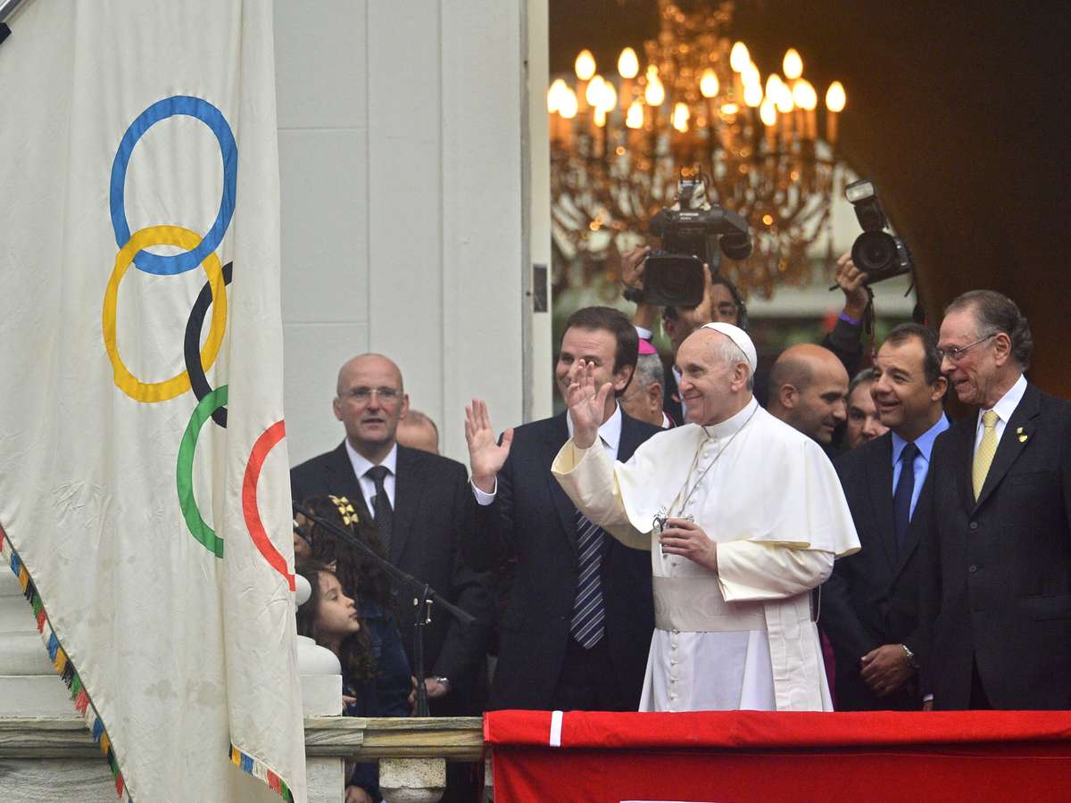25 de julho - antes de ir para a comunidade, o Papa visitou o Palácio da Cidade, onde foi recebido por autoridades e atletas. O ex-jogador de basquete, Oscar Schmidt se ajoelhou diante do pontífice