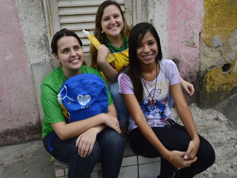 23 de julho - Últimas da fila, as peregrinas Amanda da Silva, Ana Luiza Azevedo e Clarissa Azevedo estimavam em cinco horas o tempo de espera para a retirada de seus kits