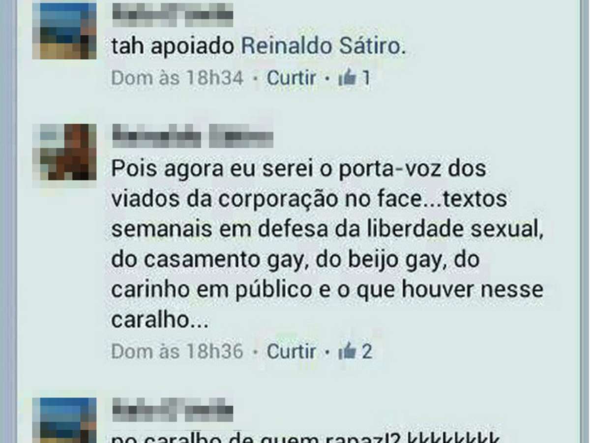 O tenente da Polícia Militar Reinaldo Sátiro é investigado pelo comando da PM por conta de uma mensagem publicada em seu perfil em uma rede social onde diz que será o "porta-voz dos viados da corporação". O militar nega que tenha sido ele o autor das declarações.