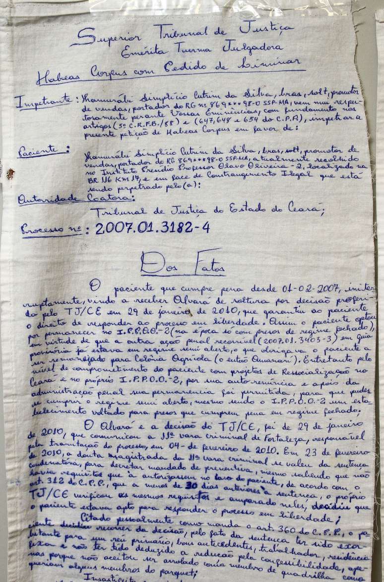 Um preso que cumpre pena na região metropolitana de Fortaleza (CE) usou um lençol para escrever um pedido de habeas corpus. No texto, Hamurabi Simplicio Contri da Silva alega que já teria direito ao sistema de progressão do regime semiaberto e pede que o benefício seja cumprido.