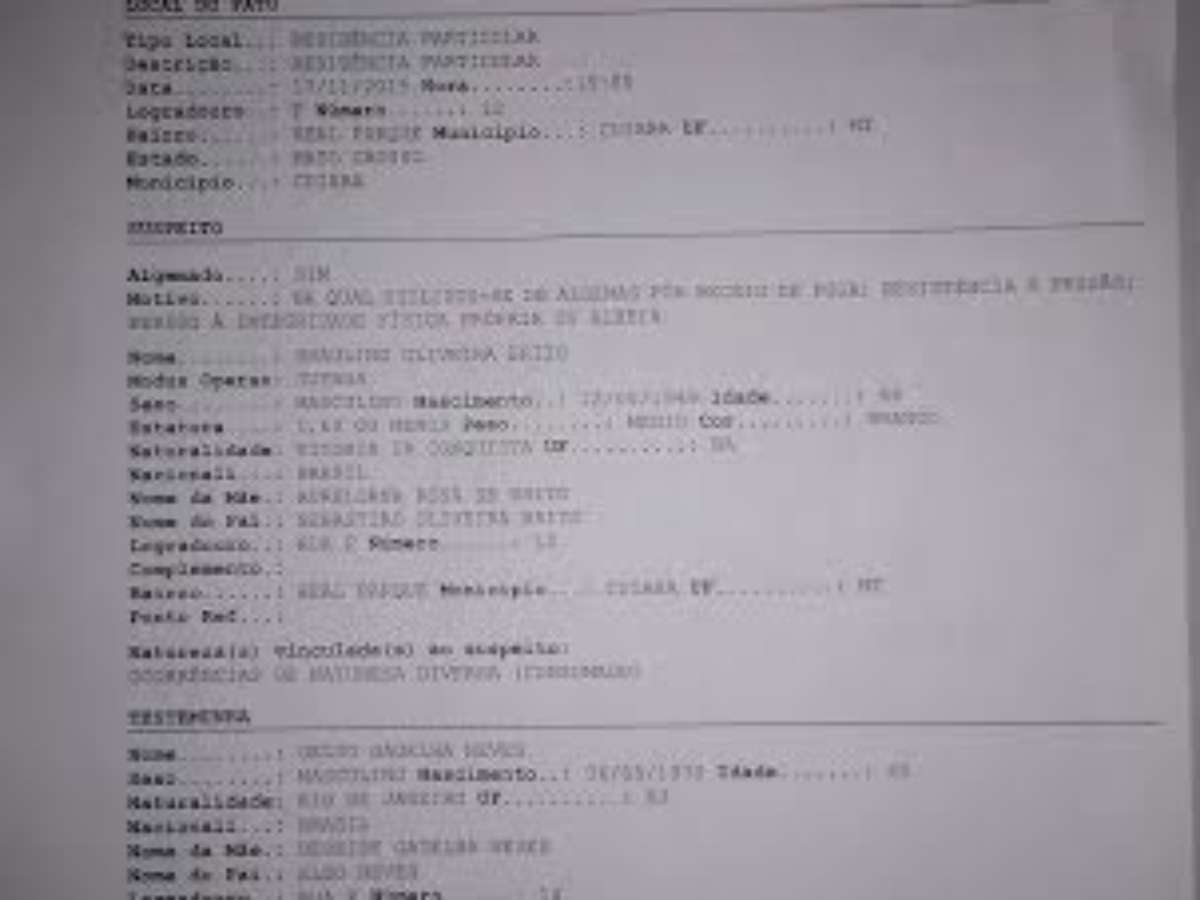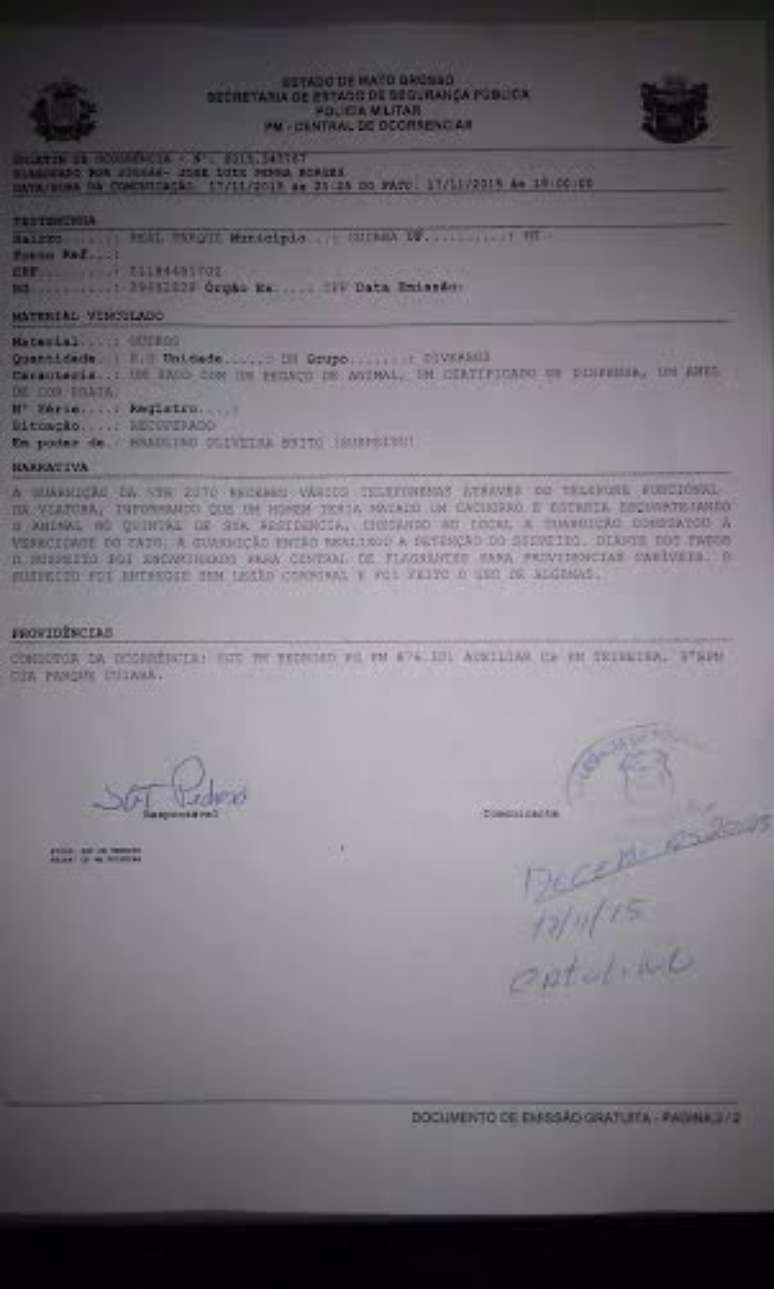 O sargento Pedroso, do 9º Batalhão da PM de Cuiabá, assinou o Boletim de Ocorrência, confirmando a "veracidade do fato". Ele encaminhou o suspeito, algemando, para a Central de Flagrantes. O uso da algema, conforme o BO, explica-se porque, conforme a PM, o idoso resistiu à prisão.
