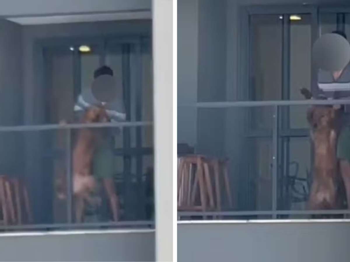 Um morador de um prédio vizinho filmou as agressões. Nas imagens, o homem aparece colocando o cachorro em pé na sacada e dá um tapa na cabeça dele, derrubando-o no chão.