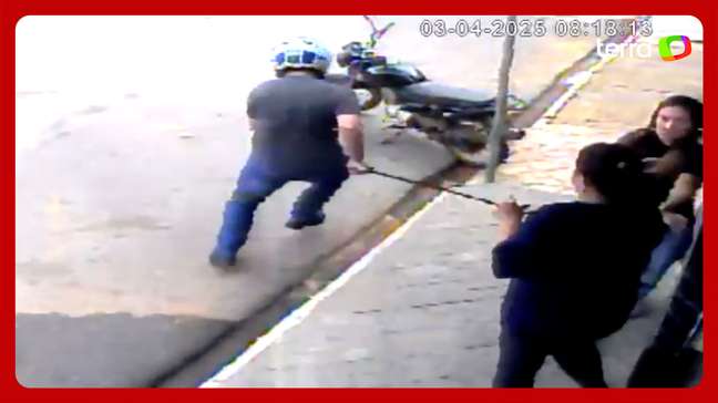O homem entra na farmácia, vai em direção ao caixa e anuncia o roubo, quando é agredido por uma mulher com uma barra de ferro. As funcionárias perseguem o suspeito até a motocicleta e o derrubam do veículo, mas ele consegue escapar.