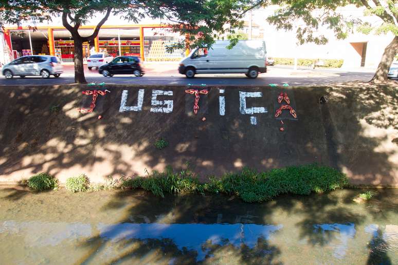 14 de novembro - Córrego Retiro Saudoso amanhece com a palavra 'Justiça' escrita à tinta e com bonecos de crianças pintadas de vermelho, representando sangue, na avenida Francisco Junqueira, em Ribeirão Preto (SP), nesta quinta-feira