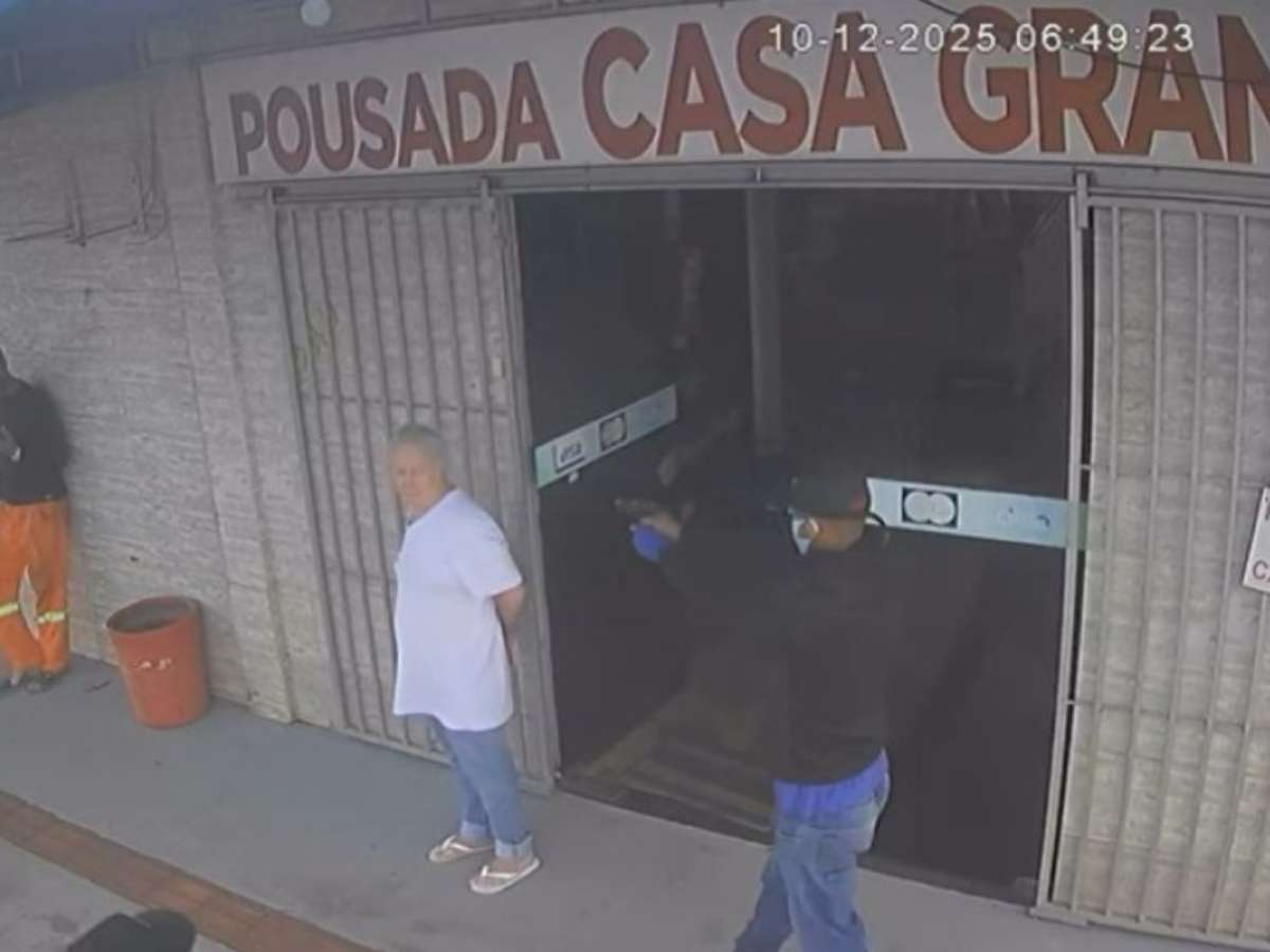 O ataque ocorreu na porta de uma pousada. Câmeras de segurança do estabelecimento registraram o momento em que dois homens mascarados se aproximam do local.
