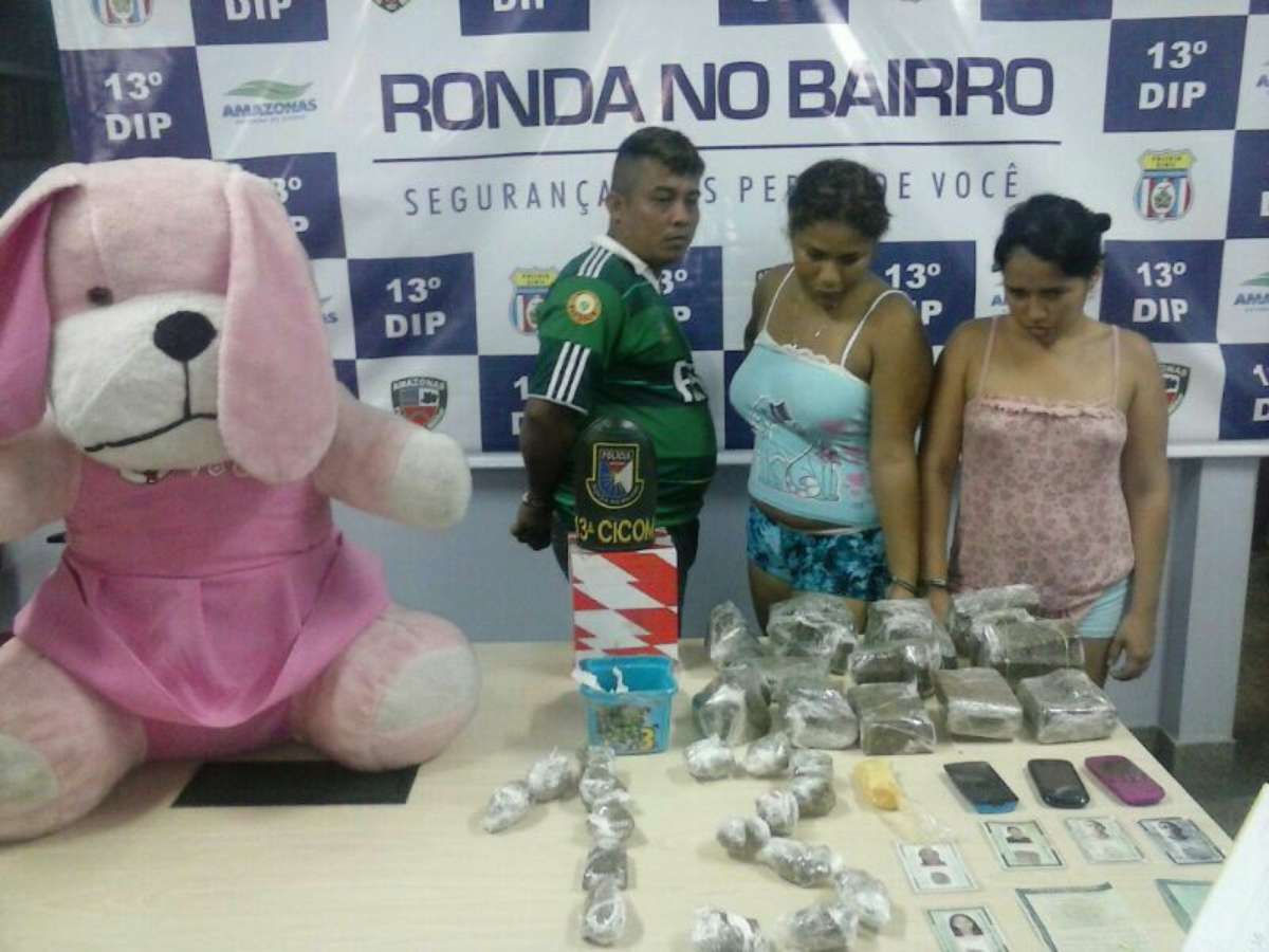 A polícia militar apreendeu 10 quilos de maconha prensada escondidos dentro de um animal de pelúcia em uma casa na zona norte de Manaus na madrugada desta segunda-feira. No local, três pessoas foram presas em flagrante por tráfico de drogas e associação para o tráfico de drogas.