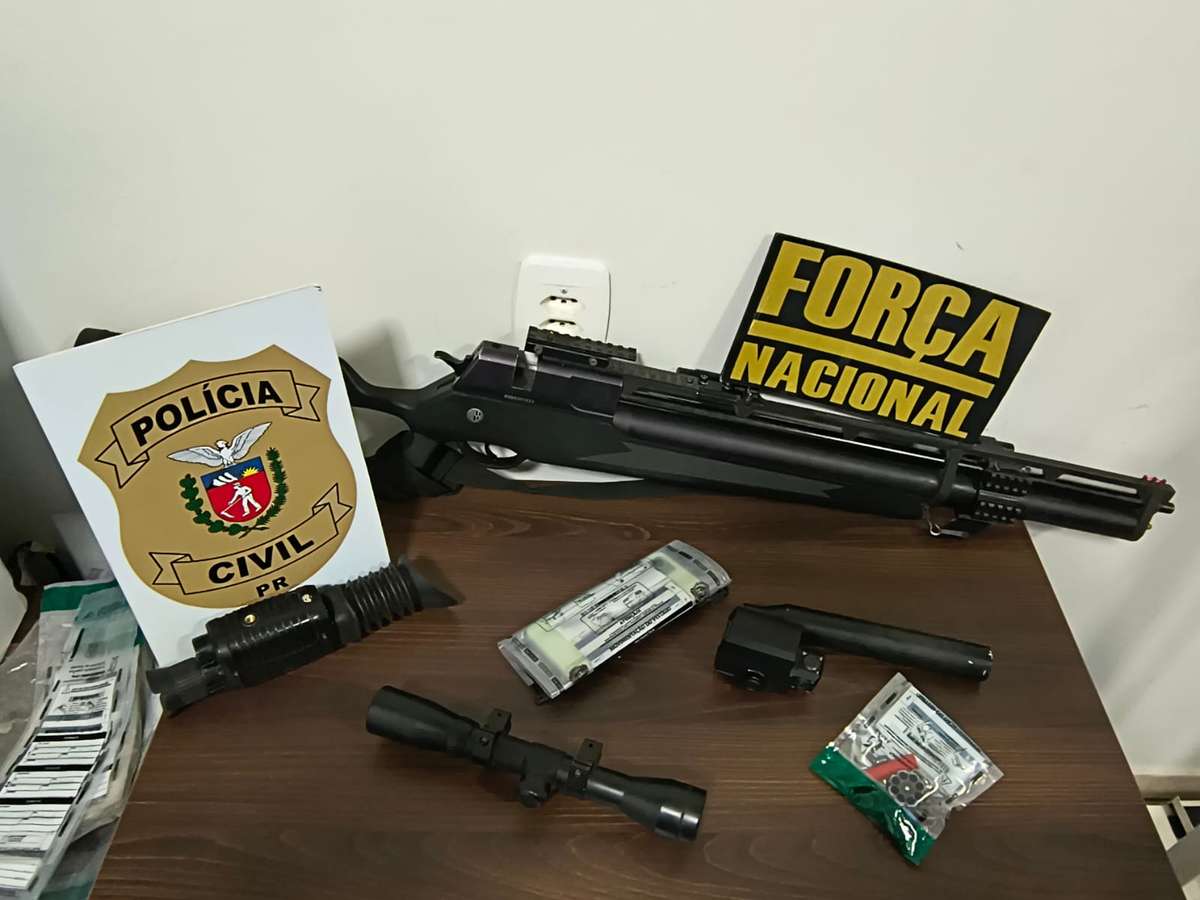 Com o apoio da Força Nacional, a PCPR cumpriu um mandado de prisão preventiva e três ordens de busca e apreensão em endereços ligados ao homem, que não teve a identidade revelada.