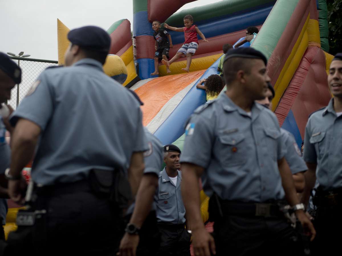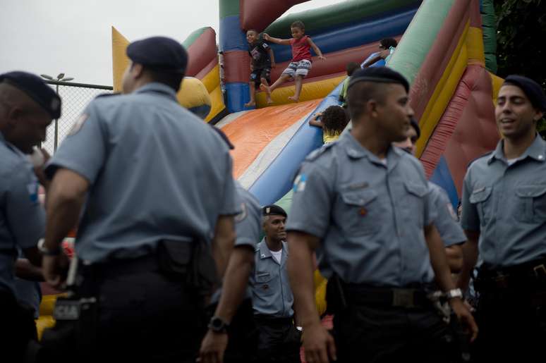 Criança brinca enquanto policiais participam da inauguração da 38ª Unidade de Polícia Pacificadora (UPP) do Rio de Janeiro, na Vila Kennedy, na zona oeste da cidade