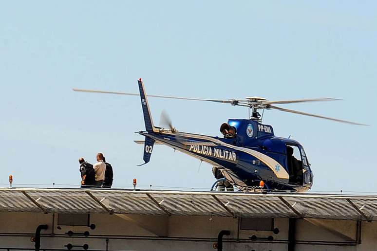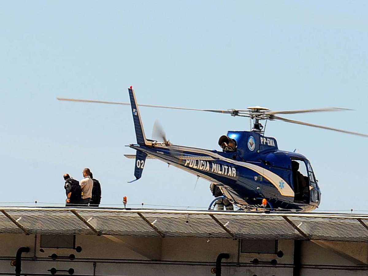 O traficante Luiz Fernando da Costa, Fernandinho Beira-Mar chega de helicóptero para seu julgamento no Tribunal de Justiça do Rio de Janeiro (TJ-RJ) na manhã desta terça-feira.