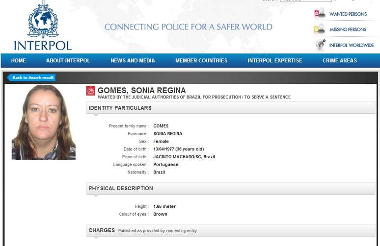 "Pelo sistema também constatamos que ela está entre os 10 brasileiros mais procurados pela Interpol", ressaltou a delegada. Sonia será encaminhada para a Penitenciária Industrial de Caxias do Sul e irá responder, além dos três mandados, também por uso de documento falso.