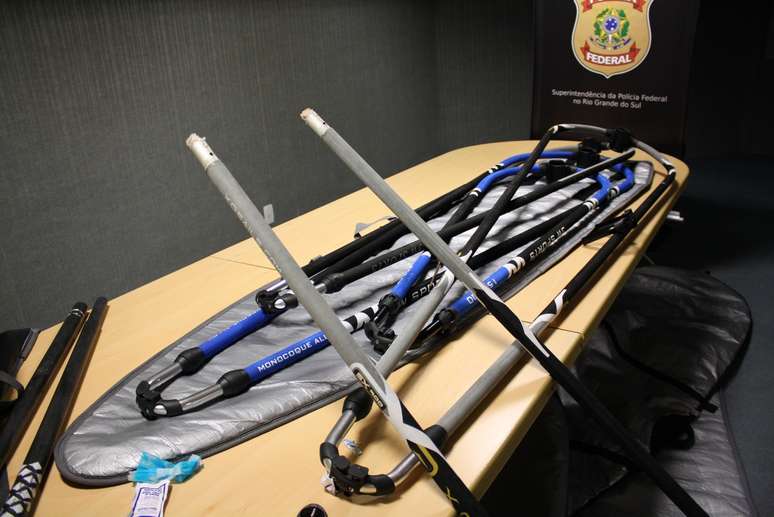 A Polícia Federal apreendeu na noite de 9 de agosto de 2013, no Aeroporto Internacional Salgado Filho, em Porto Alegre (RS), cocaína transportada dentro das estruturas tubulares da vela de uma prancha de windsurfe. O peso droga com parte das hastes de alumínio totalizou 14,7 quilos. Ao observarem os passageiros que embarcavam em voo para Portugal, policiais federais que atuam no aeroporto suspeitaram de um jovem que teria como destino final a cidade de Barcelona, na Espanha, e passaram a entrevistá-lo. Ao passar na inspeção de raio-x, o equipamento apontou a presença de substância orgânica nas hastes de alumínio da vela. O material e o suspeito foram conduzidos para a Superintendência da Polícia Federal, onde foi confirmada a presença de cocaína escondida no equipamento. O rapaz foi presoFoto: Polícia Federal / Divulgação