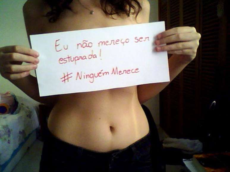 A ideia é que a gente tire a roupa e se fotografe, da cintura para cima, com um cartaz tampando os seios com os dizeres 'Eu também não mereço ser estuprada' e postemos, todas juntas, ao mesmo tempo, online. Quem tá dentro?"