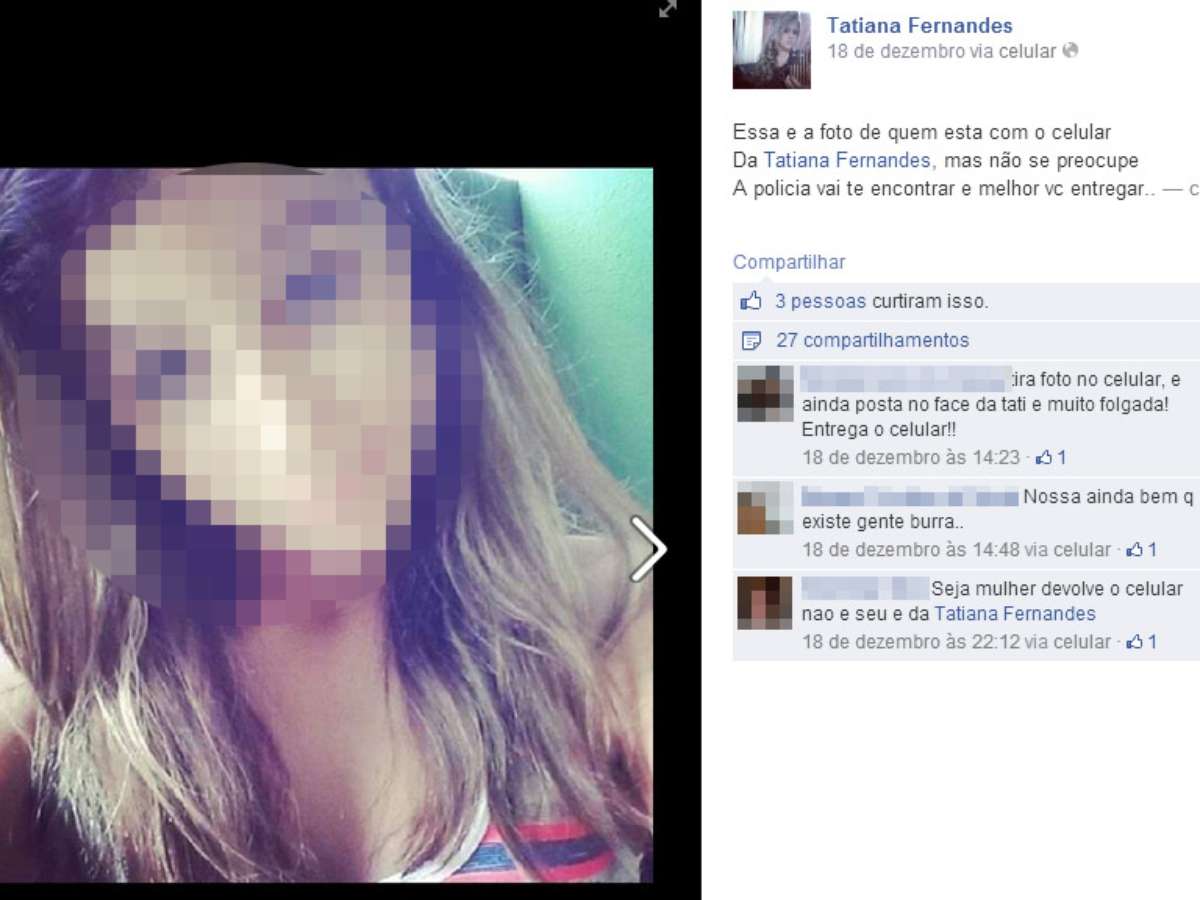 Pela própria rede social, Tatiana pediu para que as pessoas divulgassem a fotografia da mulher, que aparenta ser de uma jovem com menos de 18 anos. "Essa é a foto de quem está com o celular da Tatiana Fernandes, mas não se preocupe, a polícia vai te encontrar. É melhor ‘vc’ entregar", diz a publicação.
