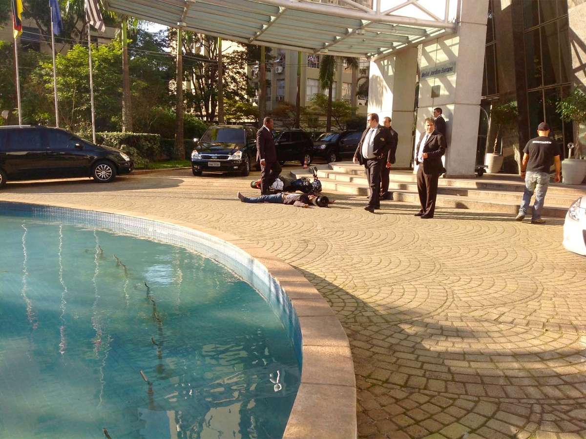 Local onde assaltante foi baleado foi isolado em frente ao hotel; a vítima da dupla era um empresário espanhol que havia acabado de sacar R$ 17 mil em duas agências bancárias da região