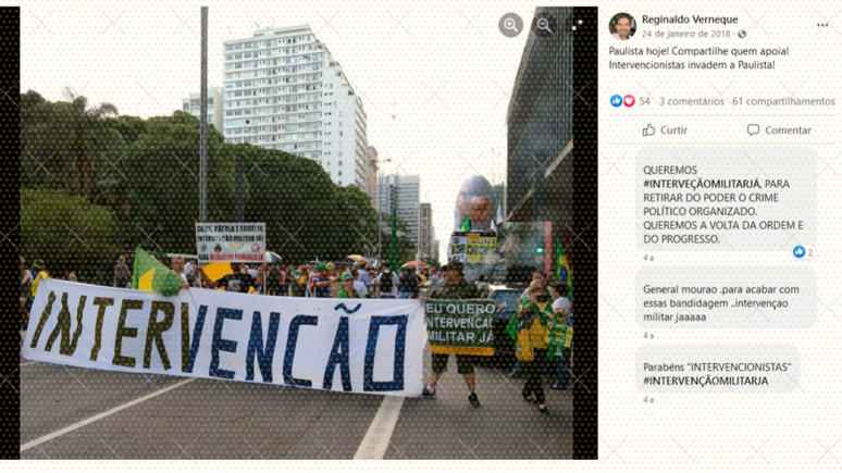 O intervencionismo de Verneque pode ser encontrado em outras redes sociais do influenciador. No Facebook, por exemplo, ele divulgou fotos de manifestantes na avenida Paulista que pediam por uma intervenção militar em janeiro de 2018 (veja abaixo). Ele defendeu no Twitter, em 2019, que o então vice-presidente Hamilton Mourão (Republicanos) assumisse a Presidência como Castelo Branco assumiu em 1964.