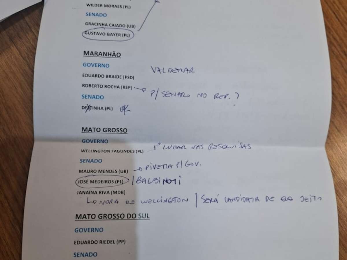 O rascunho traz notas sobre todos os Estados. Após o encontro, o partido anunciou a chapa para o Rio de Janeiro, com Douglas Ruas (PL) ao governo estadual, Rogério Lisboa (PP) de vice, e o governador Cláudio Castro e o prefeito de Belford Roxo, Márcio Canella (União) ao Senado.