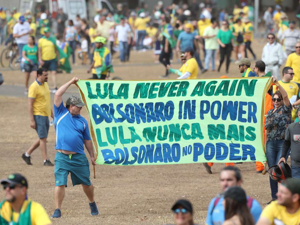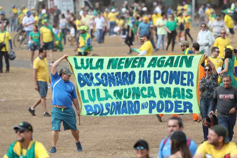 Manifestantes levam faixa com tradução em inglês com críticas a Lula e exaltação de Bolsonaro